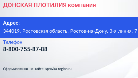 ДОНСКАЯ ПЛОТИЛИЯ, компания по адресу 344019, Ростовская область, Ростов-на-Дону, 3-я линия, 7 в дальнейшем Организация, размещена в следующих категориях:
