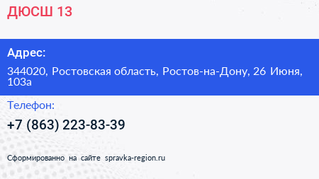 ДЮСШ №13 по адресу 344020, Ростовская область, Ростов-на-Дону, 26 Июня, 103а в дальнейшем Организация, размещена в следующих категориях: