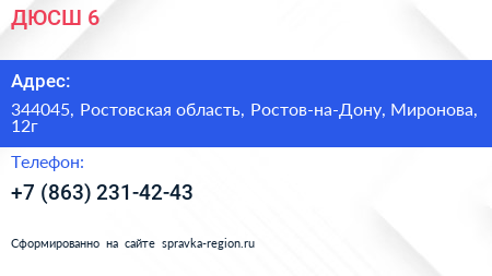ДЮСШ №6 по адресу 344045, Ростовская область, Ростов-на-Дону, Миронова, 12г в дальнейшем Организация, размещена в следующих категориях: