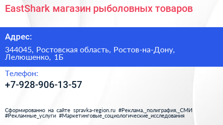 EastShark, магазин рыболовных товаров по адресу 344045, Ростовская область, Ростов-на-Дону, Лелюшенко, 1Б в дальнейшем Организация, размещена в следующих категориях:
