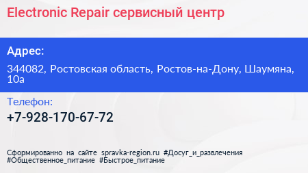 Electronic Repair, сервисный центр по адресу 344082, Ростовская область, Ростов-на-Дону, Шаумяна, 10а в дальнейшем Организация, размещена в следующих категориях: