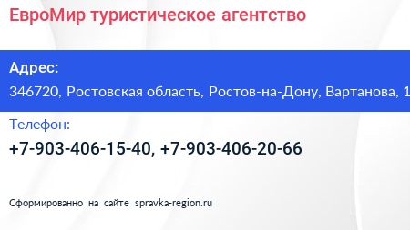 ЕвроМир, туристическое агентство по адресу 346720, Ростовская область, Ростов-на-Дону, Вартанова, 1 в дальнейшем Организация, размещена в следующих категориях: