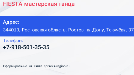 FIESTA, мастерская танца по адресу 344013, Ростовская область, Ростов-на-Дону, Текучёва, 37 в дальнейшем Организация, размещена в следующих категориях: