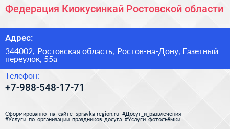 Федерация Киокусинкай Ростовской области по адресу 344002, Ростовская область, Ростов-на-Дону, Газетный переулок, 55а в дальнейшем Организация, размещена в следующих категориях: