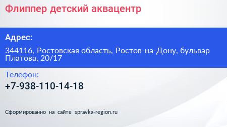 Флиппер, детский аквацентр по адресу 344116, Ростовская область, Ростов-на-Дону, бульвар Платова, 20/17 в дальнейшем Организация, размещена в следующих категориях: