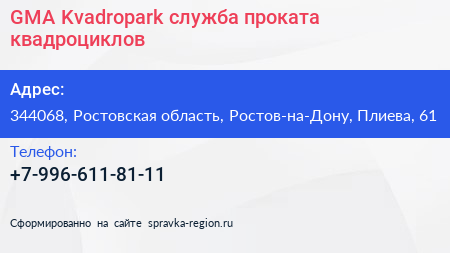 GMA Kvadropark, служба проката квадроциклов по адресу 344068, Ростовская область, Ростов-на-Дону, Плиева, 61 в дальнейшем Организация, размещена в следующих категориях: