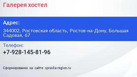 Галерея, хостел по адресу 344002, Ростовская область, Ростов-на-Дону, Большая Садовая, 67 в дальнейшем Организация, размещена в следующих категориях: