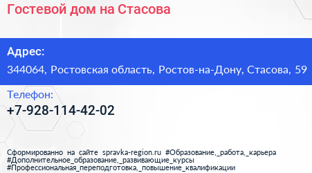 Гостевой дом на Стасова по адресу 344064, Ростовская область, Ростов-на-Дону, Стасова, 59 в дальнейшем Организация, размещена в следующих категориях: