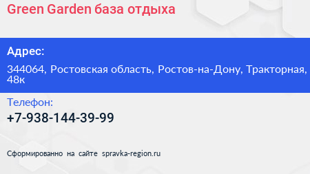 Green Garden, база отдыха по адресу 344064, Ростовская область, Ростов-на-Дону, Тракторная, 48к в дальнейшем Организация, размещена в следующих категориях:
