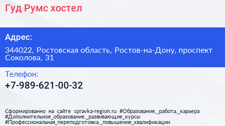 Гуд Румс, хостел по адресу 344022, Ростовская область, Ростов-на-Дону, проспект Соколова, 31 в дальнейшем Организация, размещена в следующих категориях: