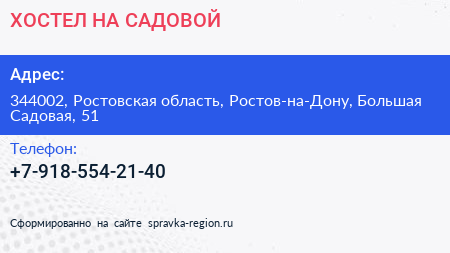 ХОСТЕЛ НА САДОВОЙ по адресу 344002, Ростовская область, Ростов-на-Дону, Большая Садовая, 51 в дальнейшем Организация, размещена в следующих категориях: