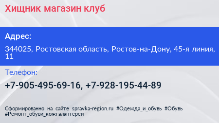 Хищник, магазин-клуб по адресу 344025, Ростовская область, Ростов-на-Дону, 45-я линия, 11 в дальнейшем Организация, размещена в следующих категориях: