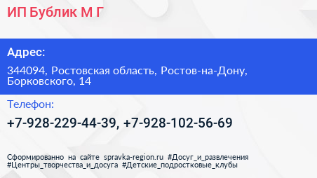 ИП Бублик М.Г. по адресу 344094, Ростовская область, Ростов-на-Дону, Борковского, 14 в дальнейшем Организация, размещена в следующих категориях: