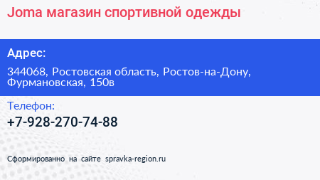Joma, магазин спортивной одежды по адресу 344068, Ростовская область, Ростов-на-Дону, Фурмановская, 150в в дальнейшем Организация, размещена в следующих категориях: