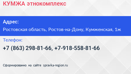 КУМЖА, этнокомплекс по адресу Ростовская область, Ростов-на-Дону, Кумженская, 1ж в дальнейшем Организация, размещена в следующих категориях: