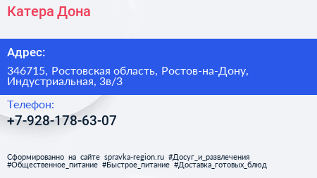 Катера Дона по адресу 346715, Ростовская область, Ростов-на-Дону, Индустриальная, 3в/3 в дальнейшем Организация, размещена в следующих категориях: