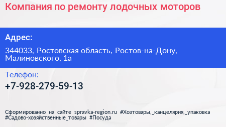Компания по ремонту лодочных моторов по адресу 344033, Ростовская область, Ростов-на-Дону, Малиновского, 1а в дальнейшем Организация, размещена в следующих категориях: