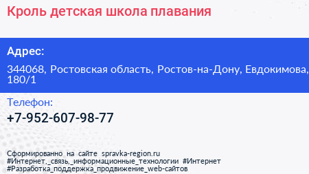 Кроль, детская школа плавания по адресу 344068, Ростовская область, Ростов-на-Дону, Евдокимова, 180/1 в дальнейшем Организация, размещена в следующих категориях: