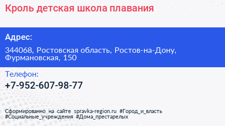 Кроль, детская школа плавания по адресу 344068, Ростовская область, Ростов-на-Дону, Фурмановская, 150 в дальнейшем Организация, размещена в следующих категориях: