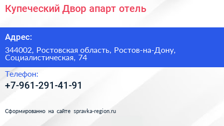 Купеческий Двор, апарт-отель по адресу 344002, Ростовская область, Ростов-на-Дону, Социалистическая, 74 в дальнейшем Организация, размещена в следующих категориях: