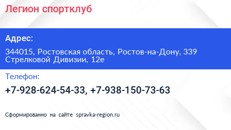 Легион, спортклуб по адресу 344015, Ростовская область, Ростов-на-Дону, 339 Стрелковой Дивизии, 12е в дальнейшем Организация, размещена в следующих категориях: