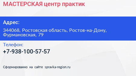 МАСТЕРСКАЯ, центр практик по адресу 344068, Ростовская область, Ростов-на-Дону, Фурмановская, 79 в дальнейшем Организация, размещена в следующих категориях: