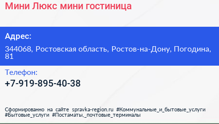 Мини Люкс, мини-гостиница по адресу 344068, Ростовская область, Ростов-на-Дону, Погодина, 81 в дальнейшем Организация, размещена в следующих категориях: