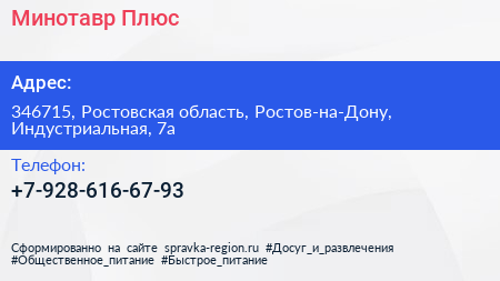 Минотавр Плюс по адресу 346715, Ростовская область, Ростов-на-Дону, Индустриальная, 7а в дальнейшем Организация, размещена в следующих категориях: