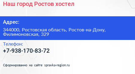 Наш город Ростов, хостел по адресу 344000, Ростовская область, Ростов-на-Дону, Филимоновская, 329 в дальнейшем Организация, размещена в следующих категориях: