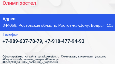 Олимп, хостел по адресу 344068, Ростовская область, Ростов-на-Дону, Бодрая, 105 в дальнейшем Организация, размещена в следующих категориях: