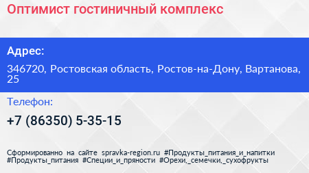 Оптимист, гостиничный комплекс по адресу 346720, Ростовская область, Ростов-на-Дону, Вартанова, 25 в дальнейшем Организация, размещена в следующих категориях: