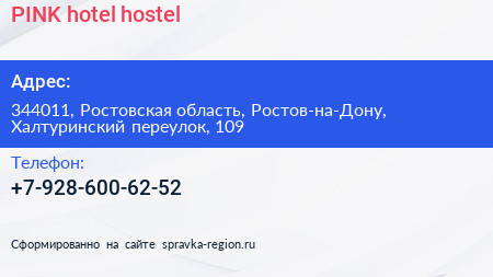 PINK hotel & hostel по адресу 344011, Ростовская область, Ростов-на-Дону, Халтуринский переулок, 109 в дальнейшем Организация, размещена в следующих категориях: