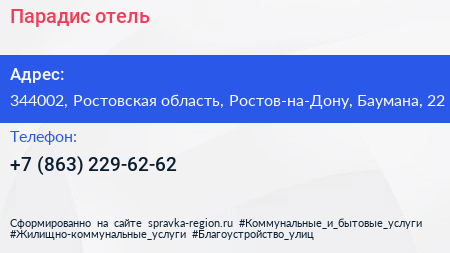 Парадис, отель по адресу 344002, Ростовская область, Ростов-на-Дону, Баумана, 22 в дальнейшем Организация, размещена в следующих категориях: