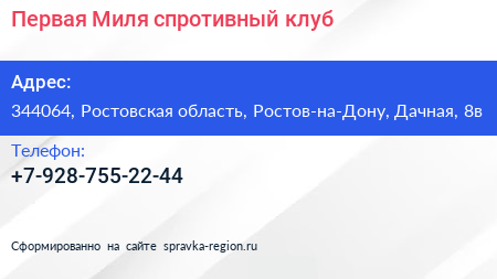 Первая Миля, спротивный клуб по адресу 344064, Ростовская область, Ростов-на-Дону, Дачная, 8в в дальнейшем Организация, размещена в следующих категориях: