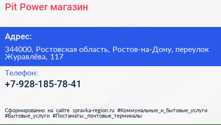 Pit Power, магазин по адресу 344000, Ростовская область, Ростов-на-Дону, переулок Журавлёва, 117 в дальнейшем Организация, размещена в следующих категориях: