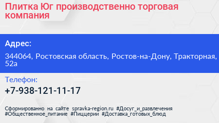 Плитка-Юг, производственно-торговая компания по адресу 344064, Ростовская область, Ростов-на-Дону, Тракторная, 52а в дальнейшем Организация, размещена в следующих категориях: