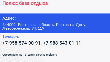 Полюс, база отдыха по адресу 344002, Ростовская область, Ростов-на-Дону, Левобережная, 94/119 в дальнейшем Организация, размещена в следующих категориях: