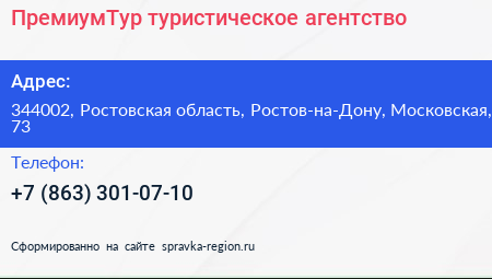 ПремиумТур, туристическое агентство по адресу 344002, Ростовская область, Ростов-на-Дону, Московская, 73 в дальнейшем Организация, размещена в следующих категориях: