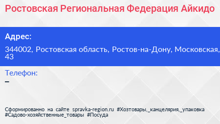 Ростовская Региональная Федерация Айкидо по адресу 344002, Ростовская область, Ростов-на-Дону, Московская, 43 в дальнейшем Организация, размещена в следующих категориях: