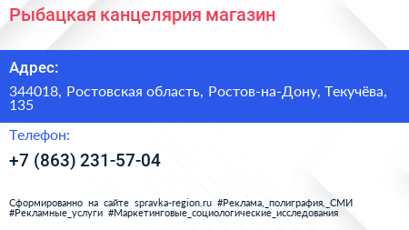 Рыбацкая канцелярия, магазин по адресу 344018, Ростовская область, Ростов-на-Дону, Текучёва, 135 в дальнейшем Организация, размещена в следующих категориях: