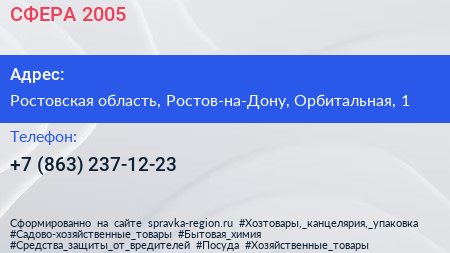 СФЕРА-2005 по адресу Ростовская область, Ростов-на-Дону, Орбитальная, 1 в дальнейшем Организация, размещена в следующих категориях: