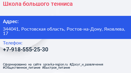 Школа большого тенниса по адресу 344041, Ростовская область, Ростов-на-Дону, Яковлева, 17 в дальнейшем Организация, размещена в следующих категориях: