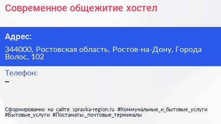 Современное общежитие, хостел по адресу 344000, Ростовская область, Ростов-на-Дону, Города Волос, 102 в дальнейшем Организация, размещена в следующих категориях: