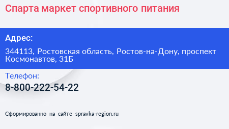 Спарта, маркет спортивного питания по адресу 344113, Ростовская область, Ростов-на-Дону, проспект Космонавтов, 31Б в дальнейшем Организация, размещена в следующих категориях: