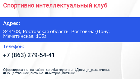 Спортивно-интеллектуальный клуб по адресу 344103, Ростовская область, Ростов-на-Дону, Мечетинская, 105а в дальнейшем Организация, размещена в следующих категориях: