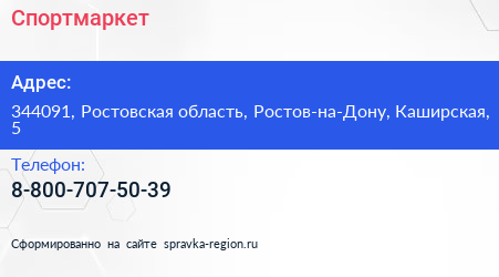 Спортмаркет по адресу 344091, Ростовская область, Ростов-на-Дону, Каширская, 5 в дальнейшем Организация, размещена в следующих категориях: