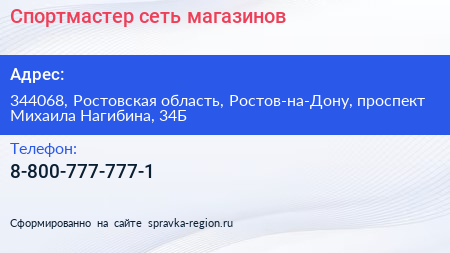 Спортмастер, сеть магазинов по адресу 344068, Ростовская область, Ростов-на-Дону, проспект Михаила Нагибина, 34Б в дальнейшем Организация, размещена в следующих категориях: