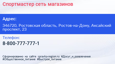 Спортмастер, сеть магазинов по адресу 346720, Ростовская область, Ростов-на-Дону, Аксайский проспект, 23 в дальнейшем Организация, размещена в следующих категориях: