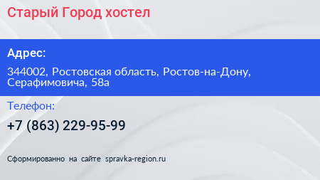 Старый Город, хостел по адресу 344002, Ростовская область, Ростов-на-Дону, Серафимовича, 58а в дальнейшем Организация, размещена в следующих категориях: