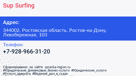 Sup Surfing по адресу 344002, Ростовская область, Ростов-на-Дону, Левобережная, 103 в дальнейшем Организация, размещена в следующих категориях: